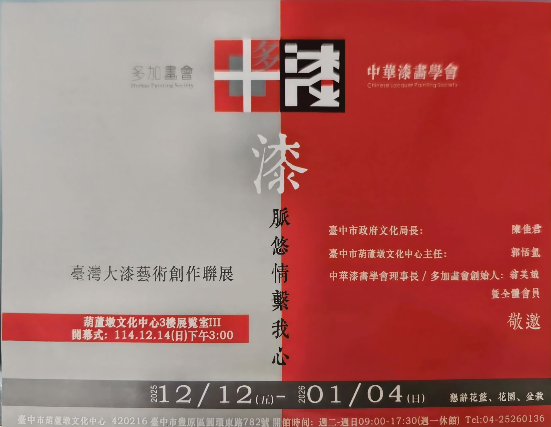 本次「漆脈悠情繫我心——臺灣大漆藝術創作聯展」展期將持續至2026年1月4日。橫跨聖誕與元旦假期,是台中市民與全台藝文愛好者不容錯過的文化饗宴。在冬日的午後,走一趟葫蘆墩文化中心,在漆黑與朱紅之間,感受那份穿越千年的溫暖與感動。
