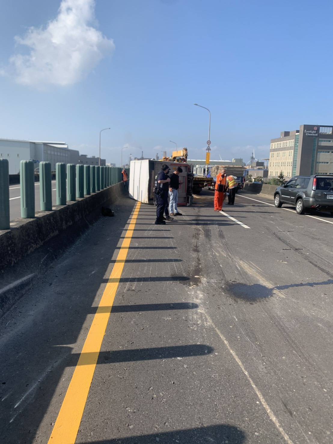 【Lai傳媒、記者爆料網/周庭慶/桃園報導】台61線快速道路桃園觀音區路段今(16)日上午發生一起交通事故!上午8時50分左右,46歲賴姓男子駕駛砂石車行經桃園市觀音區台61線南下41公里處,欲自外側車道變換至內側車道時,不明原因打滑撞上前方內側車道之小貨車,導致小貨車翻覆。