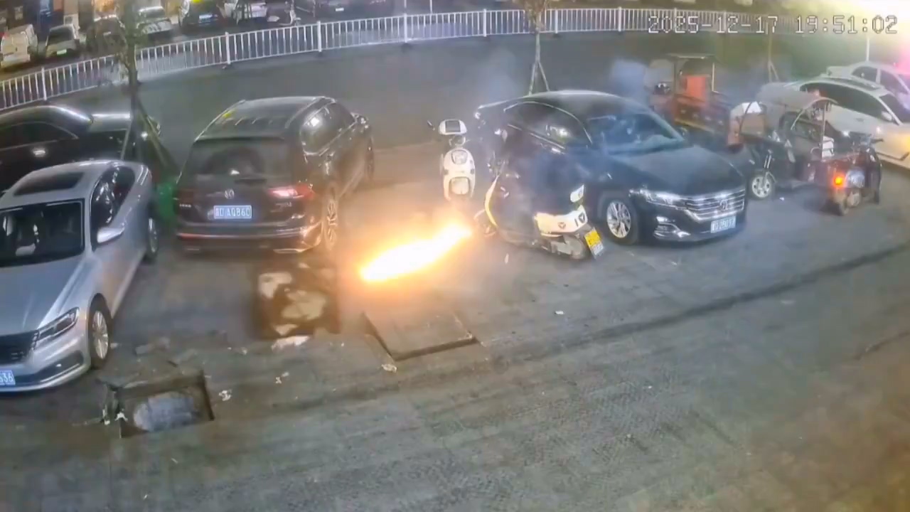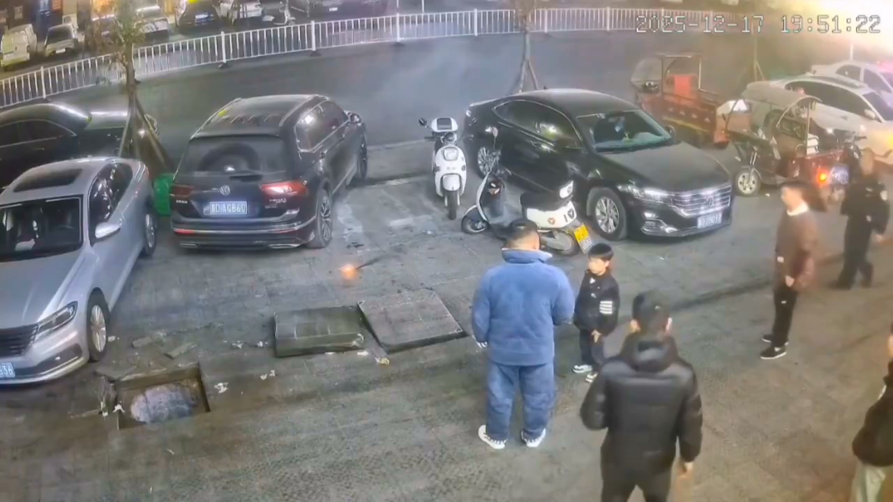 中國一名屁孩在水溝蓋旁燃放鞭炮,引發井內沼氣爆炸。