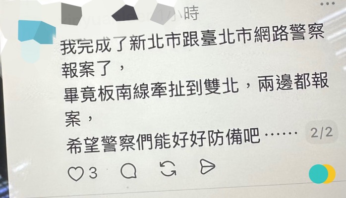 台中地檢署指出,本署獲報有不詳人士於20日上午7時2分許,以暱稱「rleioutalf710902」,在Threads留言刊登「不一樣吧!原計畫板南站內~且在5點鐘開始~所以原計畫是5點鐘開始到7點鐘的大規模隨機殺人事件」、「不是快閃中山站站外」、「光煙霧彈在板南密閉空間」、「死傷~哇塞~難怪同夥表示失敗」等恐嚇公眾安全言論,認已嚴重危害社會大眾安全,立即指派黃鈺雯檢察官指揮新北市政府警察局三峽分局及法務部調查局航業調查處,21日上午10時20分許,拘提被告張姓男子到案,並經被告同意,帶同員警返回其位於台中市清水區之住處執行搜索,當場查扣手機1支(含SIM卡1張),進行數位鑑識及比對分析,釐清被告之犯罪動機及犯罪情節。