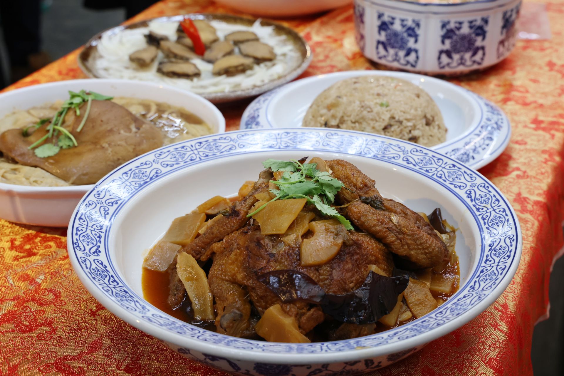 ▲學甲市場「福濬食品」推出「紅燒鳳梨家鄉雞」與「干貝蓮子魯」。(新聞處 提供)