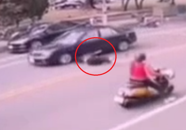 婦人穿越馬路被撞倒(紅圈處)。翻攝畫面