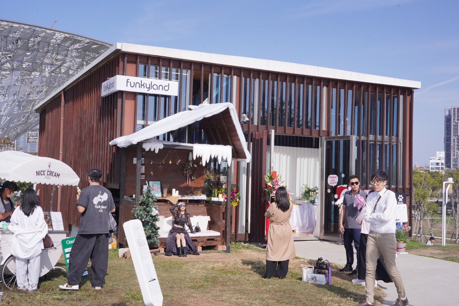 陳局長表示,Funkyland座落於味覺體驗區草坡制高點,介於綠美圖與台中國際會展中心之間,視野遼闊、位置優越,是園區中極具辨識度的新亮點。無論從空中花園、會展中心二樓平台、經貿五路跨橋,甚至舊機場跑道草坪遠望,都能看見其獨特建築線條,宛如自然地景中的現代藝術。自11月2日配合「台中市民野餐日」試營運以來,已吸引不少市民與網紅造訪,成功為中央公園注入嶄新的休憩與消費動能。