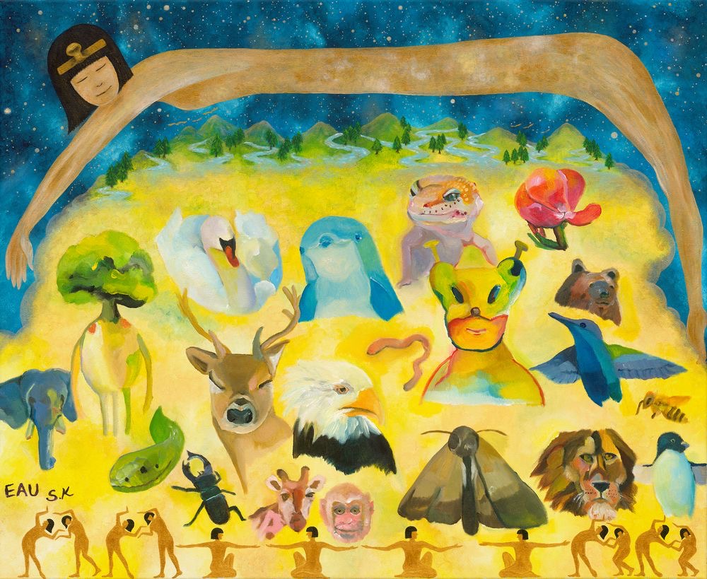 展覽作品同樣回應人與自然的緊密連結。郭家秀與廖可薇共同創作的《五次元伊甸園》,描繪星空女神努特張開雙臂,溫柔守護宇宙萬物。畫中融合山川、樹木與大地意象,象徵地球母親無私滋養生命,並細膩呈現22種不同物種,寓意萬物雖各自不同,卻能在守護、分享與支持中,和諧共存,創造共享共榮的世界。
