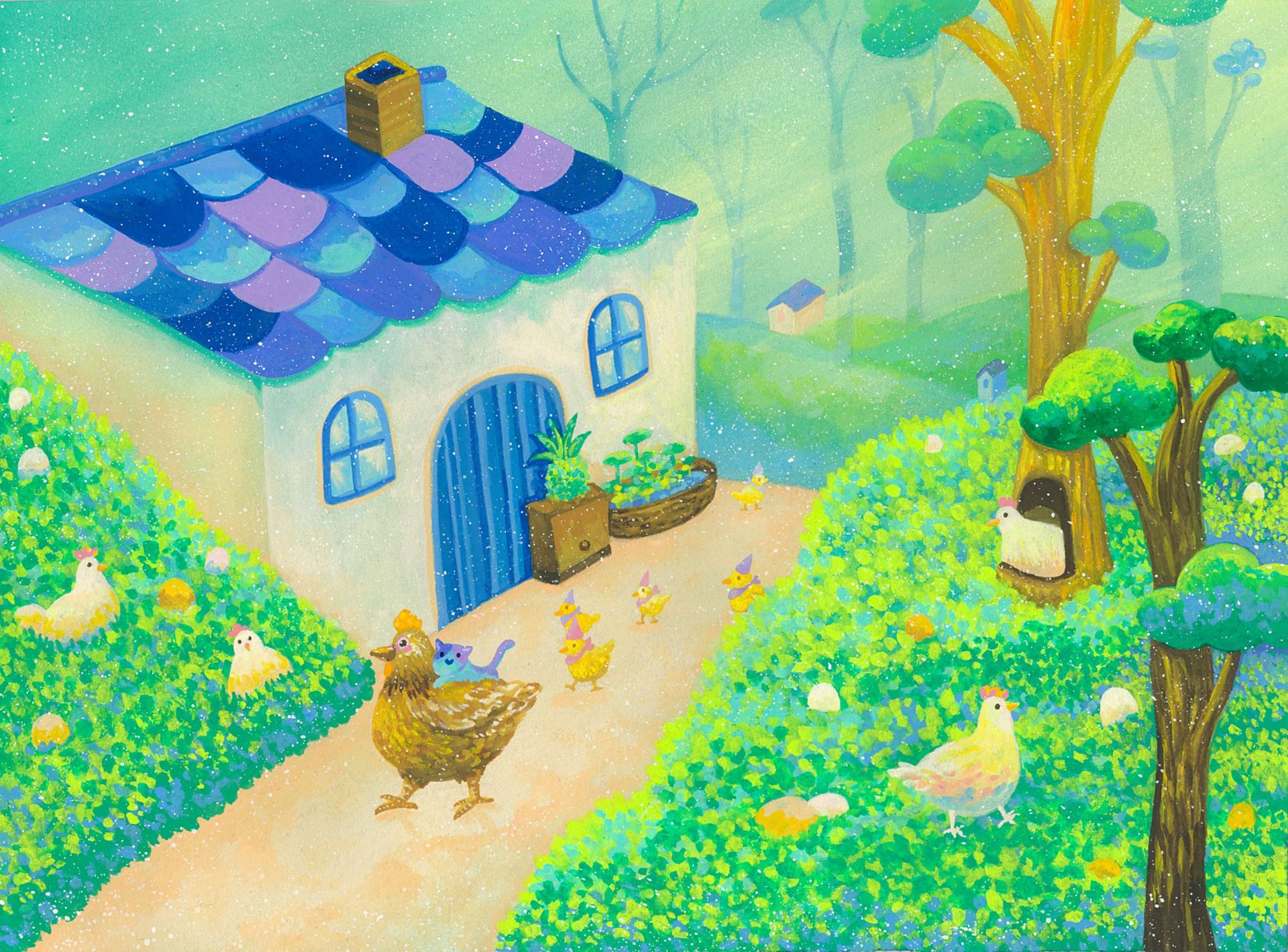 Nyumori 的作品《自由森林》,則源自日本雞隻自然牧養的理念。畫面中,雞群在森林裡自在漫步、自由下蛋,享受陽光灑落的日光浴,呈現一種尊重生命本能、回歸自然節奏的理想狀態,也呼應展覽對永續農業與動物友善的關注。