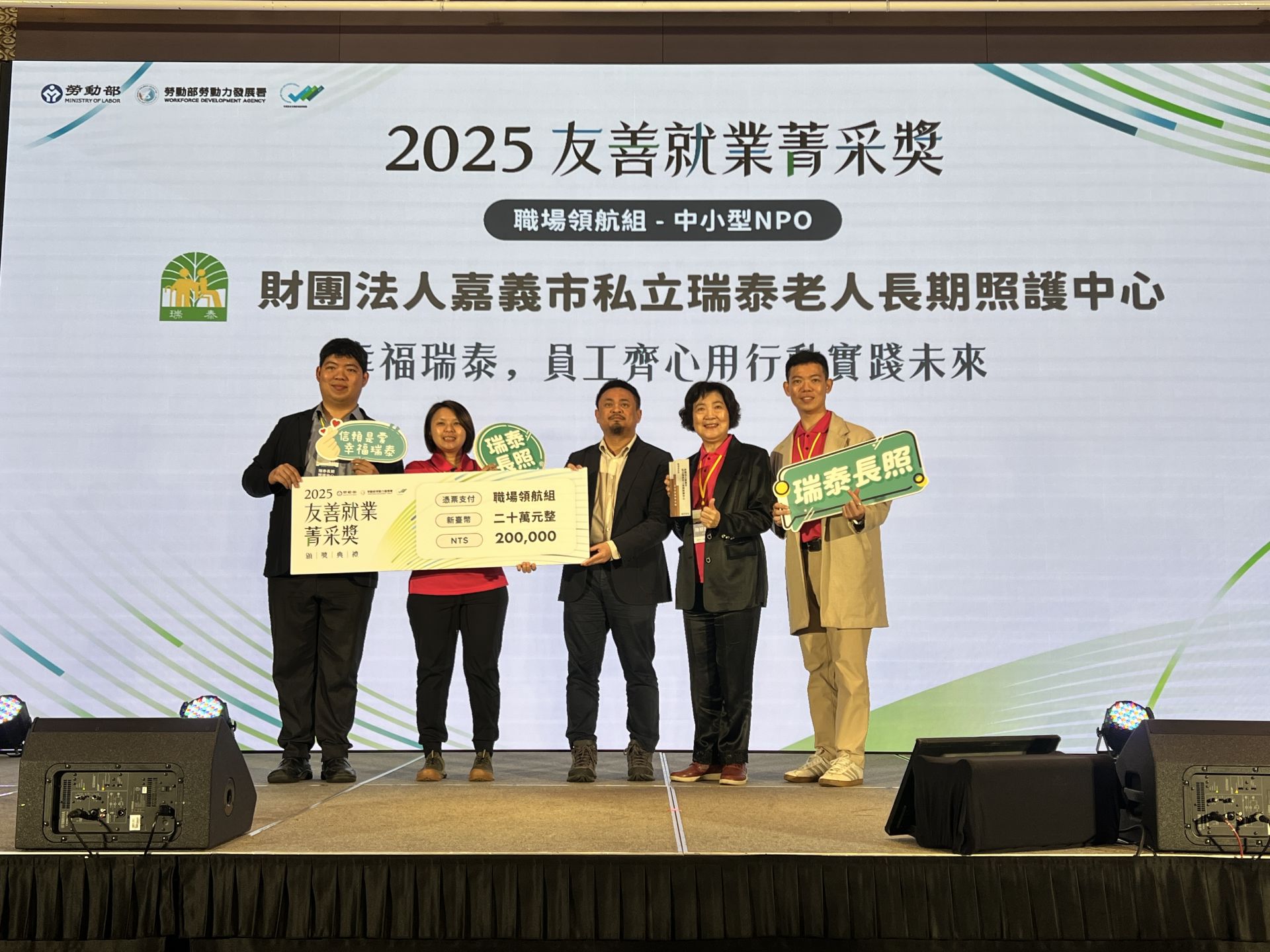 ▼嘉義市私立瑞泰老人長期照護中心榮獲勞動部「2025友善就業菁采獎非營利組織「職場領航組」殊榮。(圖/雲嘉南分署提供)