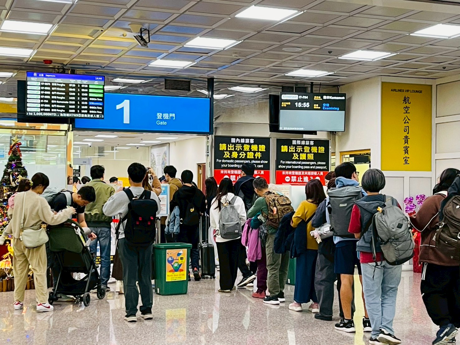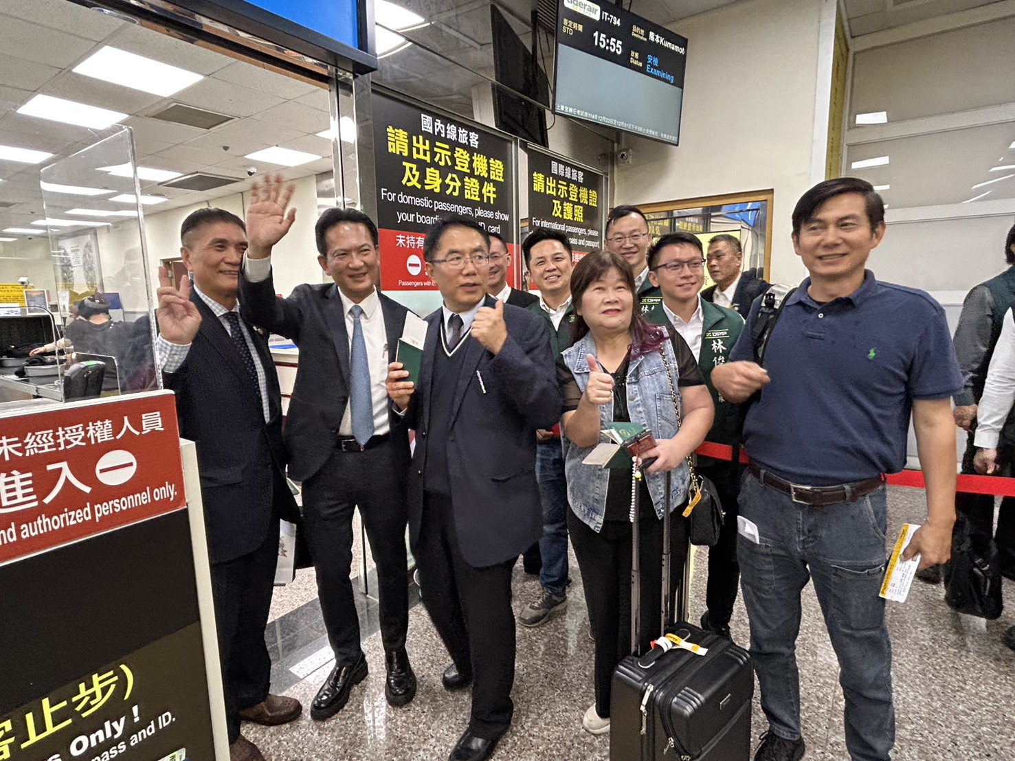 ▲市長黃偉哲與立委林俊憲等人也坐首航班機前往熊本。(記者黃雋淮 攝)
