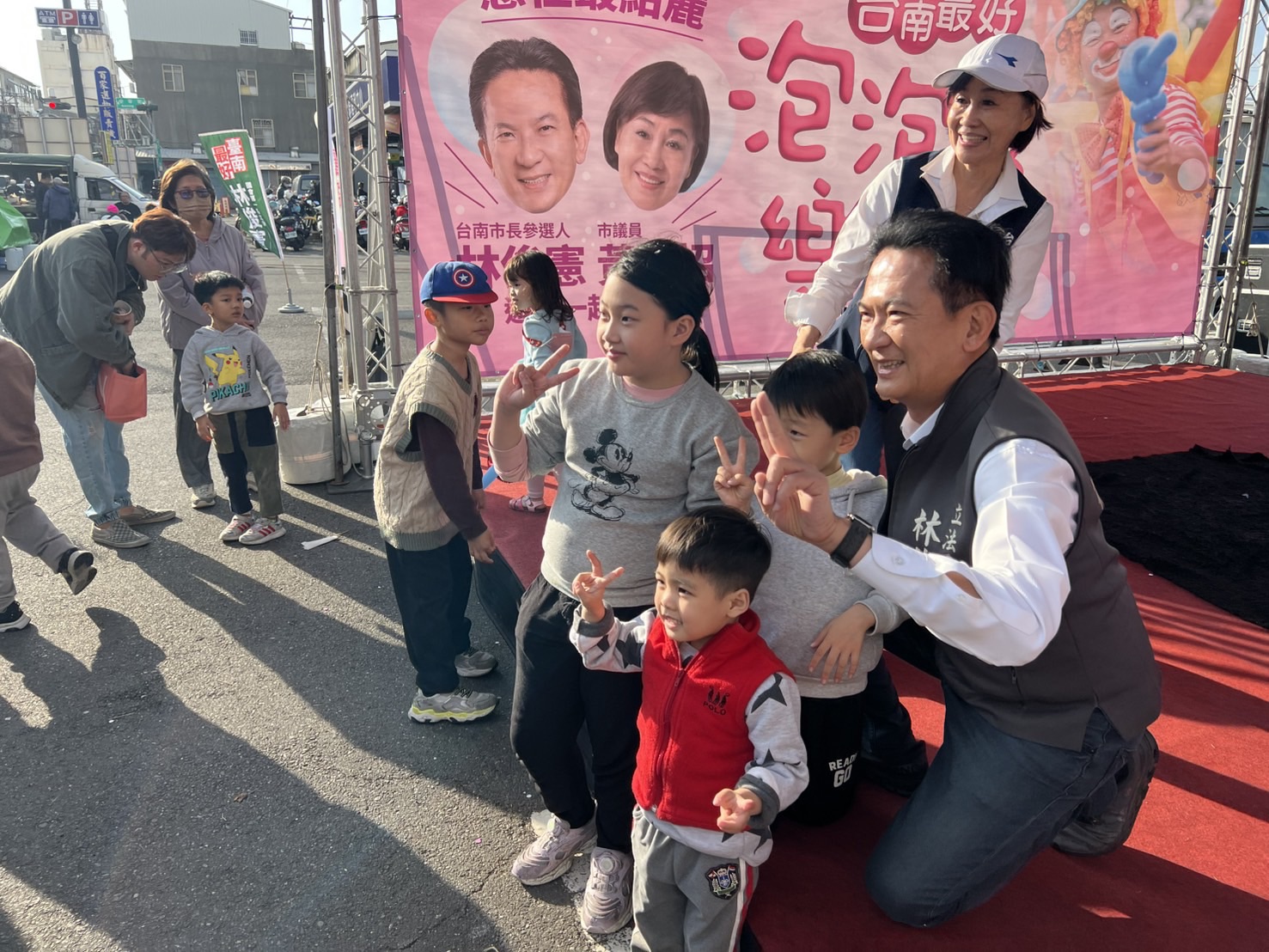 到了下午,林俊憲轉往安南區,與市議員黃麗招共同合辦親子同樂活動,現場安排魔術泡泡秀等親子互動表演,吸引許多家長攜帶孩子踴躍參與。林俊憲親切與大小朋友互動、合影,展現親民形象,也讓不少家長直呼「很接地氣」,活動現場充滿歡笑聲與聖誕節氣氛。