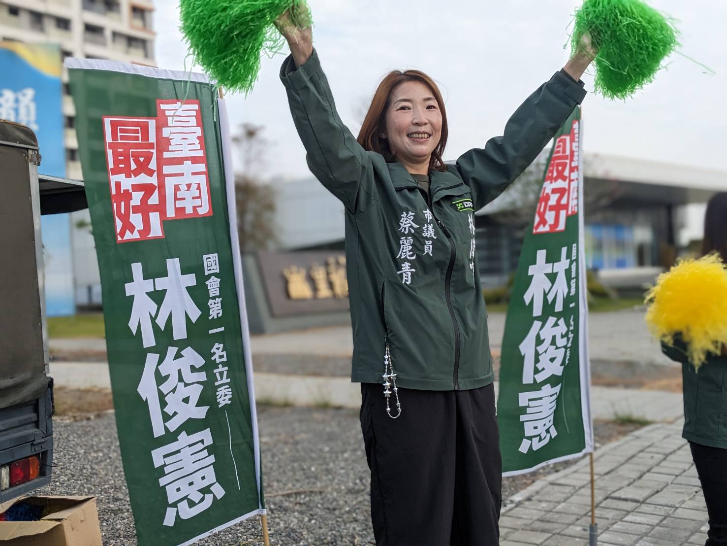 ▲市議員蔡麗青幫市長參選人林俊憲定點拜票。(立委林俊憲團隊 提供)