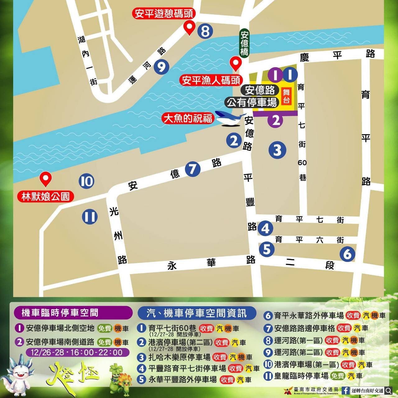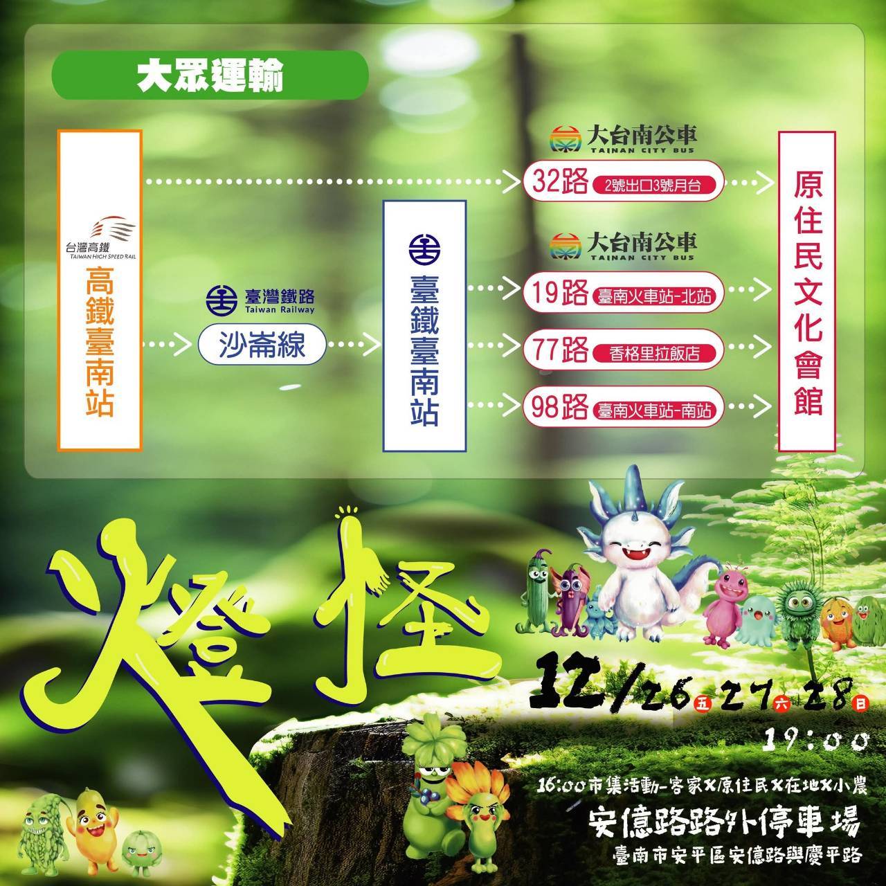 為因應演出期間可能出現的交通壅塞,建議可優先選擇大眾交通運輸工具前往,搭乘高鐵的民眾可於臺南站2號出口3號月台轉乘「32路」公車;搭乘火車的民眾則可於臺南火車站北站搭乘「19路」、南站搭乘「98路」,或於香格里拉飯店站位搭乘「77路」公車,均可直達「原住民文化會館」站下車步行前往會場,警察局第四分局也將與交通局即時監控路況,在安億橋及安億路口等沿線重要路段部署警力與義交,彈性進行交通管制,確保行車動線順暢並紓解車流,提醒開車前往的民眾可多加利用運河路、平豐路、港濱停車場及皇龍臨時停車場,騎乘機車的民眾,可多加利用安億停車場北側空地及安億停車場南側道路等活動臨時機車停放區。