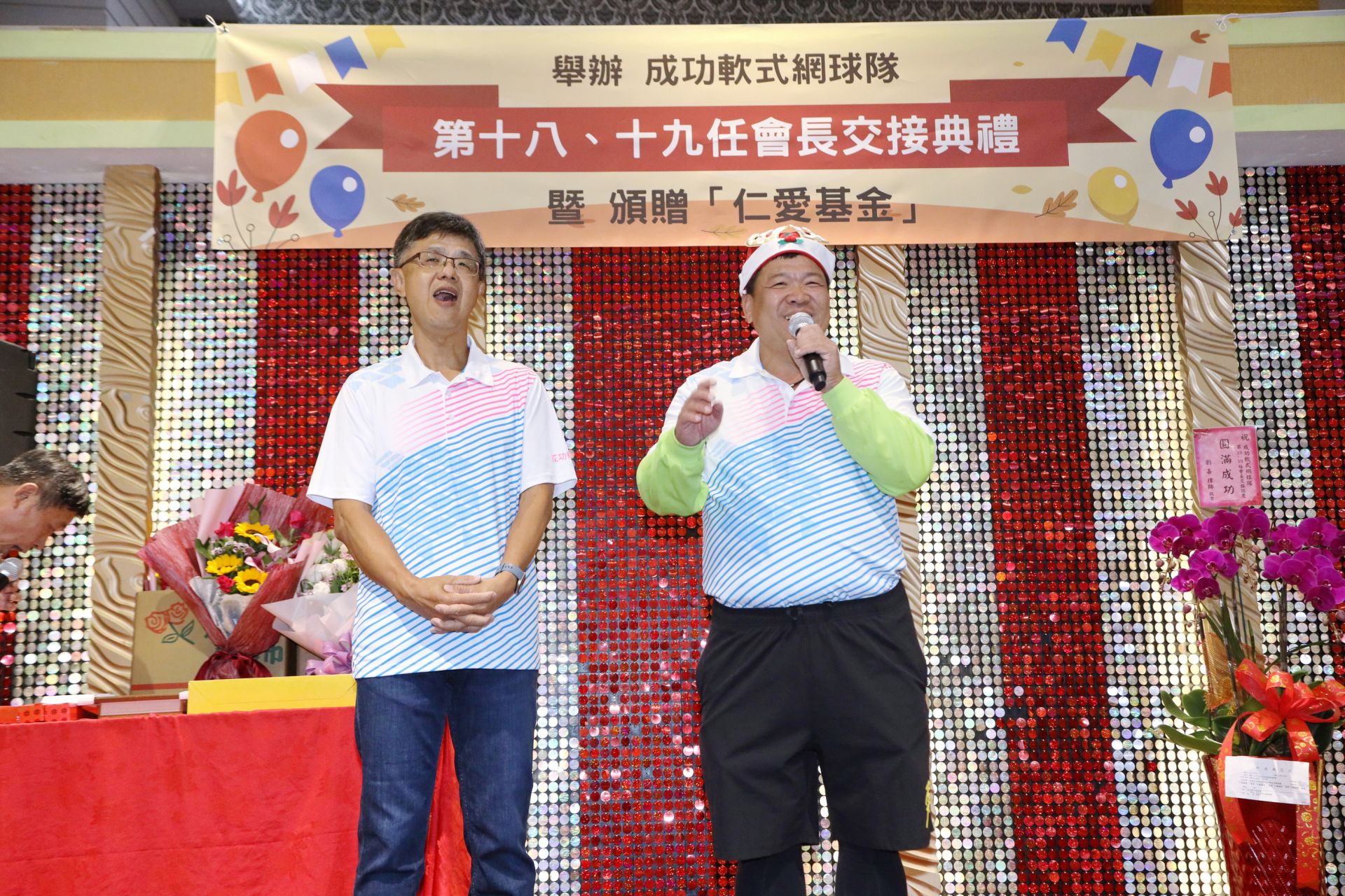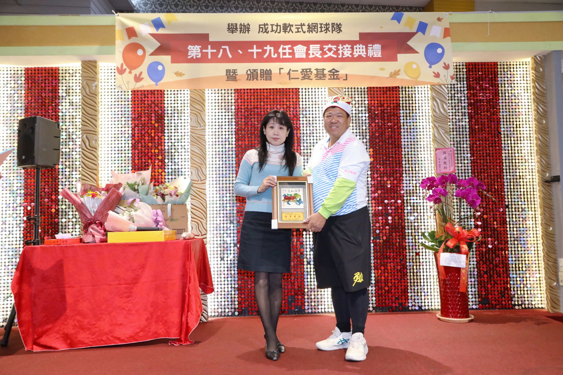 【視傳媒記者朱克明/台中報導】台中市東區成功軟式網球隊於27日晚間,假新林海鮮餐廳舉行第十八、十九屆會長交接典禮。典禮中,卸任會長洪宏瑩正式將會務移交給新任會長林文仲,現場邀請地方民代、運動界人士共襄盛舉,席開33桌,場面熱烈。