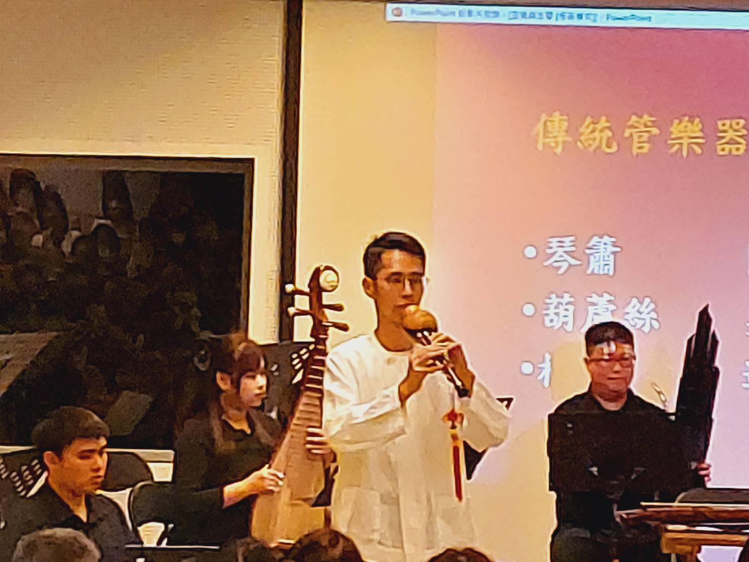 本場音樂會由校友會理事長葉彩娟主持,特邀高師大音樂系鄭溪和老師,以三國時代諸葛亮的智慧與《空城計》為引線,深入解說古琴樂曲的歷史背景與文化意涵。演出由「未央集」樂團呈現,古琴演奏家陳濬寬老師與駐團作曲家陳睿霆合作,將歷史、文學與音樂交織成章,展現古琴在千年典故中的獨特魅力。