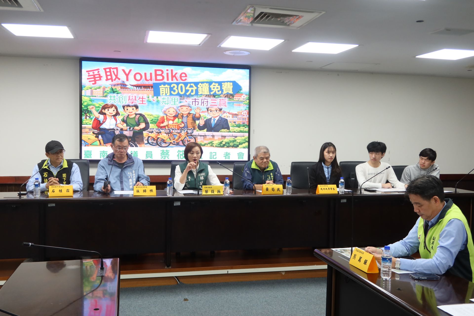 國立成功大學學生關心通學權益,主張比照多數六都做法,爭取台南 YouBike「前30分鐘免費」,今(30)日在台南市議會召開記者會,說明政策訴求與實際使用經驗,台南市議員蔡筱薇也偕同成大里長張歸樵、圍下里長石桂霖、大學里長黃荀武到場聲援,肯定年輕世代主動投入公共議題,並承諾持續在地方協助推動,共創學生、鄰里、市府三贏。