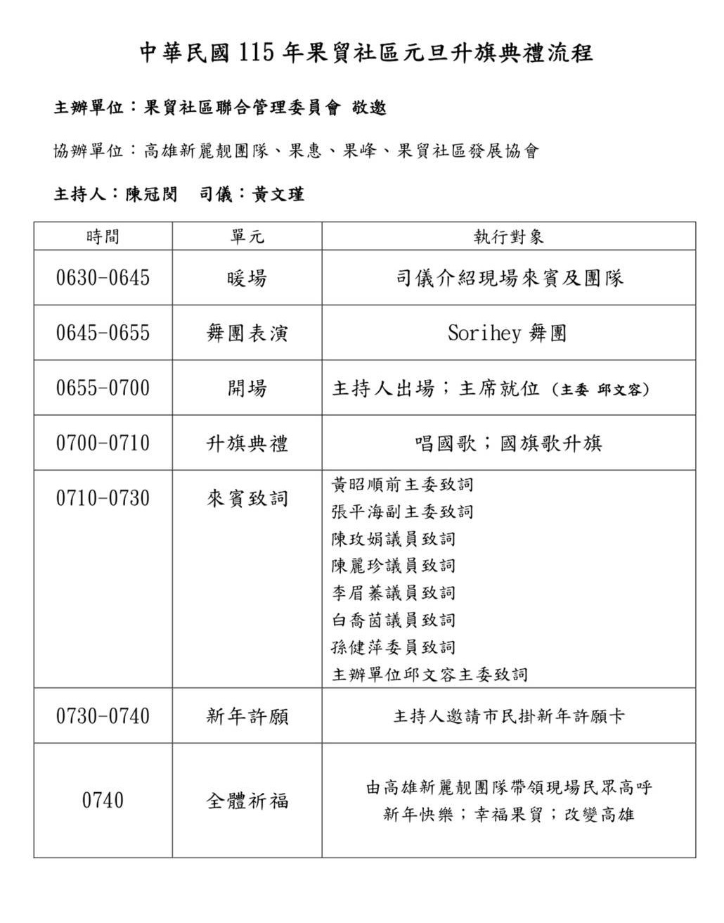 果貿社區聯合管理委員會誠摯邀請所有鄉親朋友踴躍參加,一同為國家祈福、為社區祝願,在升起的國旗見證下,迎向幸福、平安、興旺的嶄新一年。