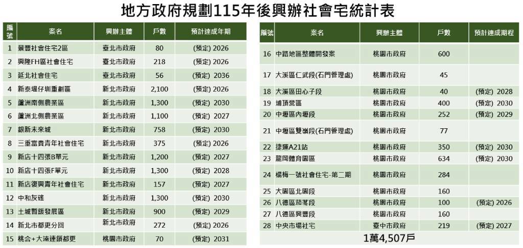 地方政府規劃115年後興辦社會住宅統計表。圖/內政部國土管理署提供