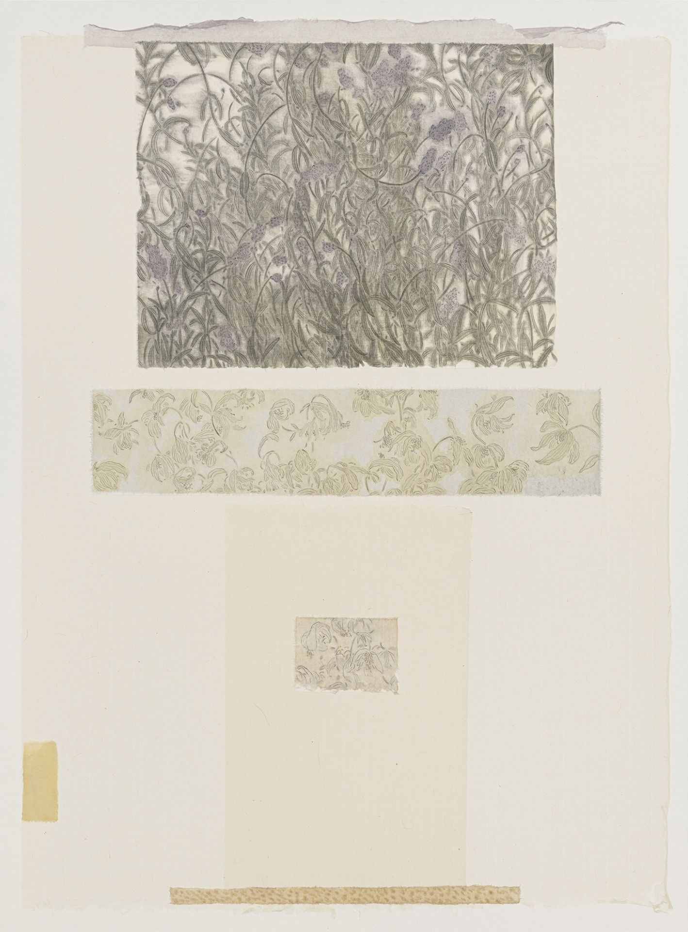 作品中的留白不僅延續東方美學的觀照與節奏,更轉化為關於「當下被喚醒的瞬間」之感知經驗。在〈路徑圖〉系列中,藝術家將散步時的視線與身體軌跡轉化為圖像痕跡,如同被攤開的手卷,將時間的推移凝縮於紙層之間;〈花束〉系列則揉合生活中所見的植物意象,如同由風帶來的記憶片段,在畫面上靜靜綻放。部分作品以屏風般的形式與展場空間相互呼應,使風的流動得以延伸至場域之中,成為介於物件、空間與身體之間的敏感交流。