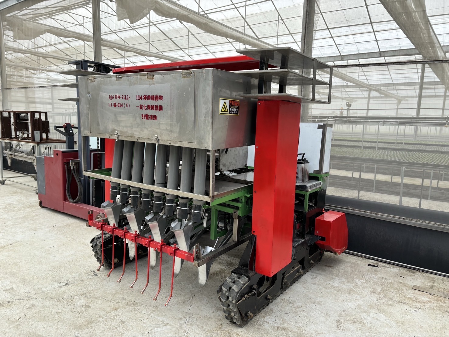 農業局長李芳林說明,丹娜絲颱風造成嘉南等地農業損失慘重,尤其以溫網室設施毀損最為嚴重,截至目前農業局已輔導轄區農友申辦溫網室設施重建201件,面積為42.59公頃,感謝農業部農糧署提高設施補助額度至8成,減少農友負擔可以儘速復建重新投入生產。面對極端型氣候的挑戰,這次災後許多農友也陸續轉型為結構型溫網室設施,除了更為穩固也符合農業生產的需求。特別感謝臺南區農業改良場團隊,輔導本專區建置一貫化自動化農機生產設備,包含自動化育苗生產線、機械化整地整型設備、蔬菜移植機及遙控噴藥機等,從育苗至栽培管理之田間作業過程,減少農業所需勞動力,提升生產效能。