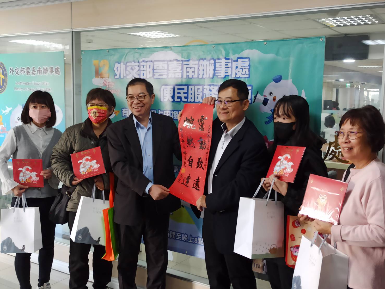 另於114年農曆春節前,辦事處於領務大廳致贈外交部林部長題字春聯及限量紅包袋禮盒予洽公民眾,並舉辦有獎徵答及「音樂快閃」活動;同時透過嘉義正聲廣播電台專訪,宣導「有條件式線上申換護照」自7月1日實施之便民措施,廣受民眾好評。
