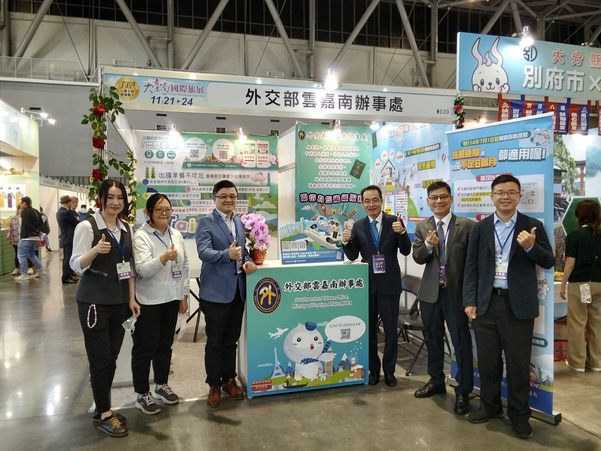 此外,辦事處於114年11月21日至24日參與於大臺南會展中心舉行之「大臺南國際旅展」,設攤宣導旅外安全注意事項及最新領務便民措施。旅展期間,外交部領事事務局鄭局長正勇亦特別南下出席,並與曾處長共同主持「出國機票快閃抽獎」活動,現場氣氛熱絡。四天展期共吸引逾3,000名民眾至攤位參觀互動,成效顯著。