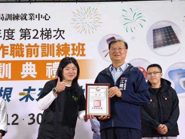 【視傳媒記者吉雄世高雄報導】高市勞工局產訓合作訓練班於12月30日舉辦結訓典禮,共計137位學員順利學成結訓,典禮以「技能扎根,未來啟動」為主題,意喻學員經過4個月的學習磨練,習得一技專長,讓技能成為未來的發電機,在職場上重新啟動,綻放自我光彩。江健興局長恭喜學員們即將展翅迎接職涯新旅程,期許面對未來新的職涯階段,要相信自己的能力,不要害怕挑戰和困難。江局長表示,受訓期間透過每天累積的努力與進步,就是在為技能扎根打基礎,讓未來可以更穩、更有力量。現今職場環境變化快速,而在產訓班學到的,不只是一項技能,還包括面對變化與困難的勇氣及韌性,勉勵學員持續學習,不論是就業、轉職、創業,甚至跨領域發展,都能以今天的成果為起點,勇敢去挑戰、去實踐未來的夢想與目標。