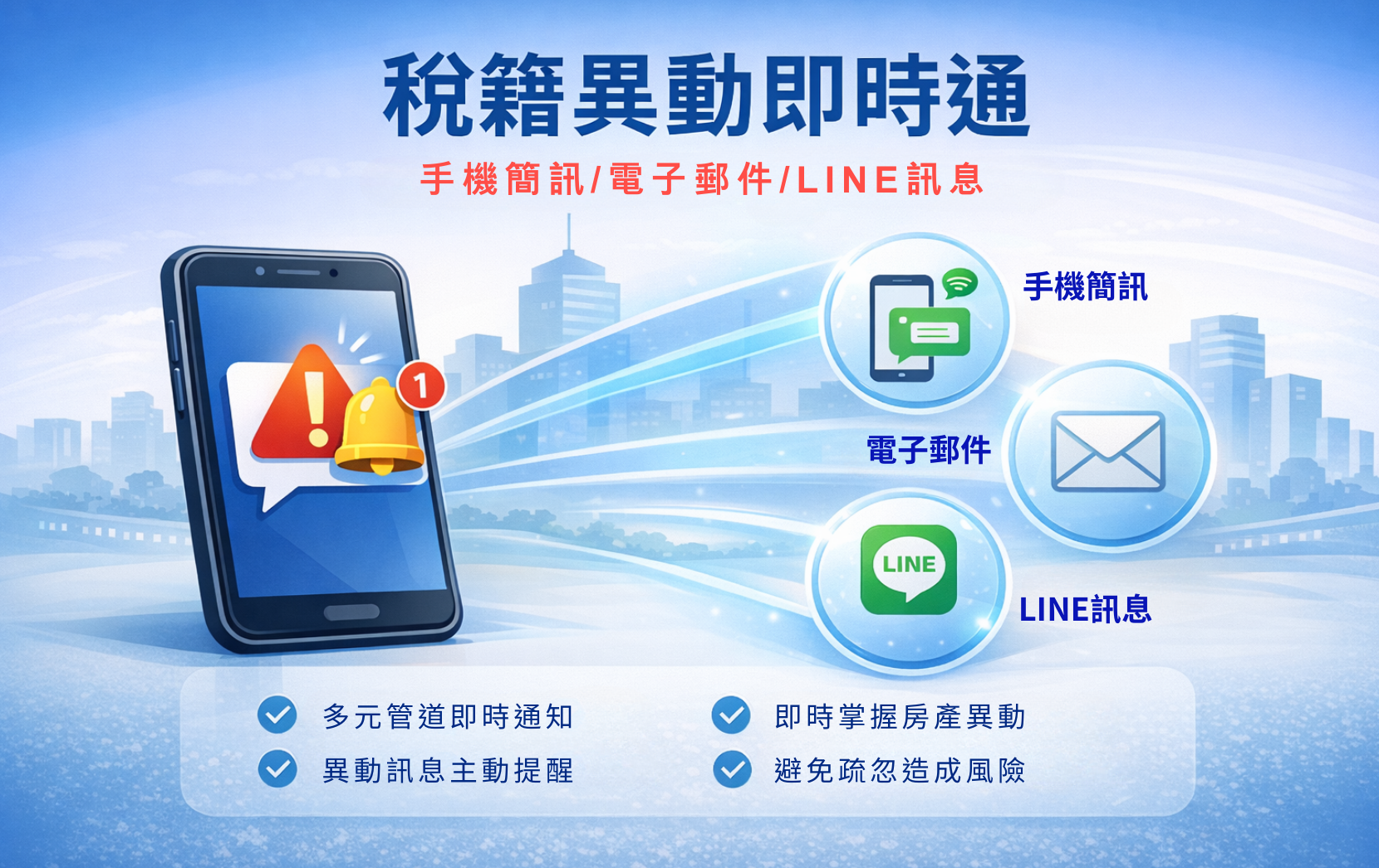 稅務局指出,「稅籍異動即時通」並非供民眾查詢資料之用,而是著重於「即時提醒」。民眾完成申請設定後,若名下房屋或土地被申報辦理與移轉相關的稅務作業,系統將於案件受理時發送通知,使所有權人能第一時間掌握狀況,及早確認並採取必要因應措施。