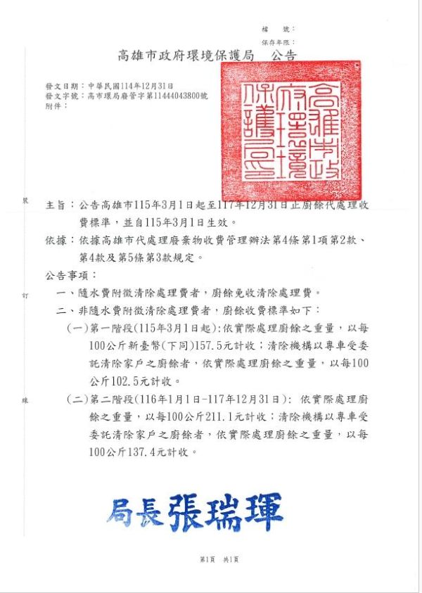 環保局指出,現行由清潔隊收運廚餘、且屬「隨水費附徵清除處理費」的家戶,仍維持免另行收費;但非隨水費附徵清除處理費者,將依《高雄市代處理廢棄物收費管理辦法》,自115年3月1日起,於岡山、仁武及南區三座焚化廠等指定開放場所,針對進場代處理廚餘開始收費。