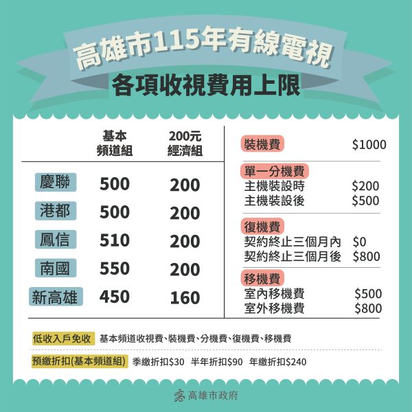 高市府表示,高雄市115年5家有線電視業者每月基本頻道組收視費用上限介於新臺幣450元至550元,裝機費1,000元,復機費800元,室內移機費500元、室外移機費800元,單一分機費在主機裝設時200元、主機裝設後500元;而高市府社會局登記有案之低收入戶享有免收收視費等各項費用之優惠。