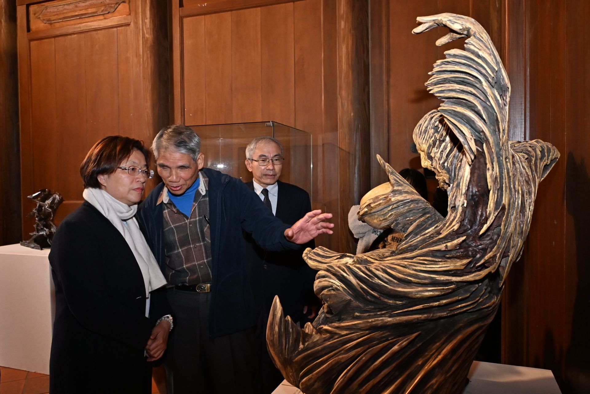 王惠美指出,黃老師1990年曾入選教育部「重要民族藝術薪傳計畫」,師承李松林藝師,使木雕技藝更加精湛,1995年榮獲民族工藝獎,2003年再獲第三屆國家工藝獎一等獎,相關作品受國立臺灣工藝研究發展中心、國立歷史博物館及各縣市文化單位典藏,成為臺灣木雕發展的重要代表。本次展覽延續黃國書老師彰化縣美術家接力展第79棒展覽的精神,展出雕刻作品11件與鋼筆畫8幅,雕刻作品以內斂而深刻的造形語彙,描繪鄉土生活、生命修行與內在覺醒的歷程;鋼筆畫則記錄鹿港巷弄、老街與日常風景,留存許多今日已難再見的城市記憶,彌足珍貴。