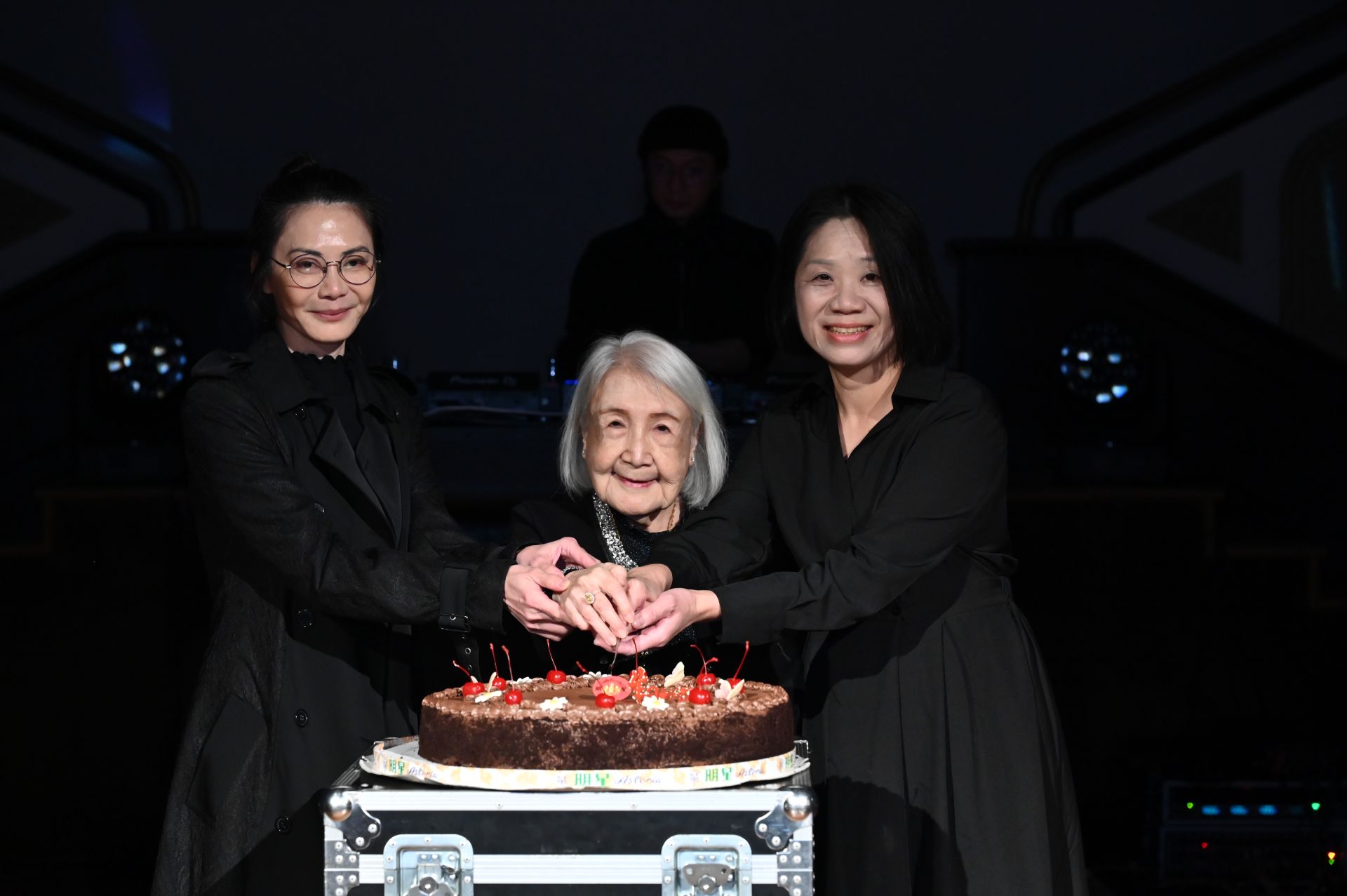 臺北市中山堂歡慶九十歲生日,右起中山堂主任江孟芳、舞蹈前輩江明珠女士、國際舞台文化表演藝術交流協會理事長黃舒郁,於生日蛋糕前共同見證中山堂九十週年的重要時刻。(圖/中山堂提供)