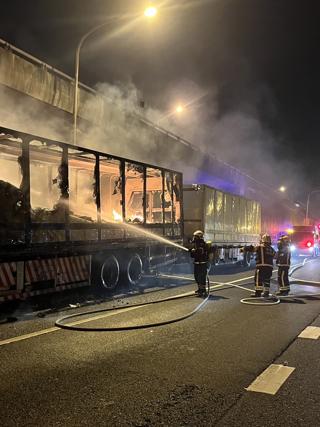 國道公路警察局第一公路警察大隊指出,勤務指揮中心於凌晨1時2分左右接獲通報,國道1號北向43.7公里林口路段有全聯結車起火燃燒,隨即派遣巡邏車趕赴現場,並同步通知消防單位支援。警消到場後,立即封閉外側路肩及外側車道進行處理。
