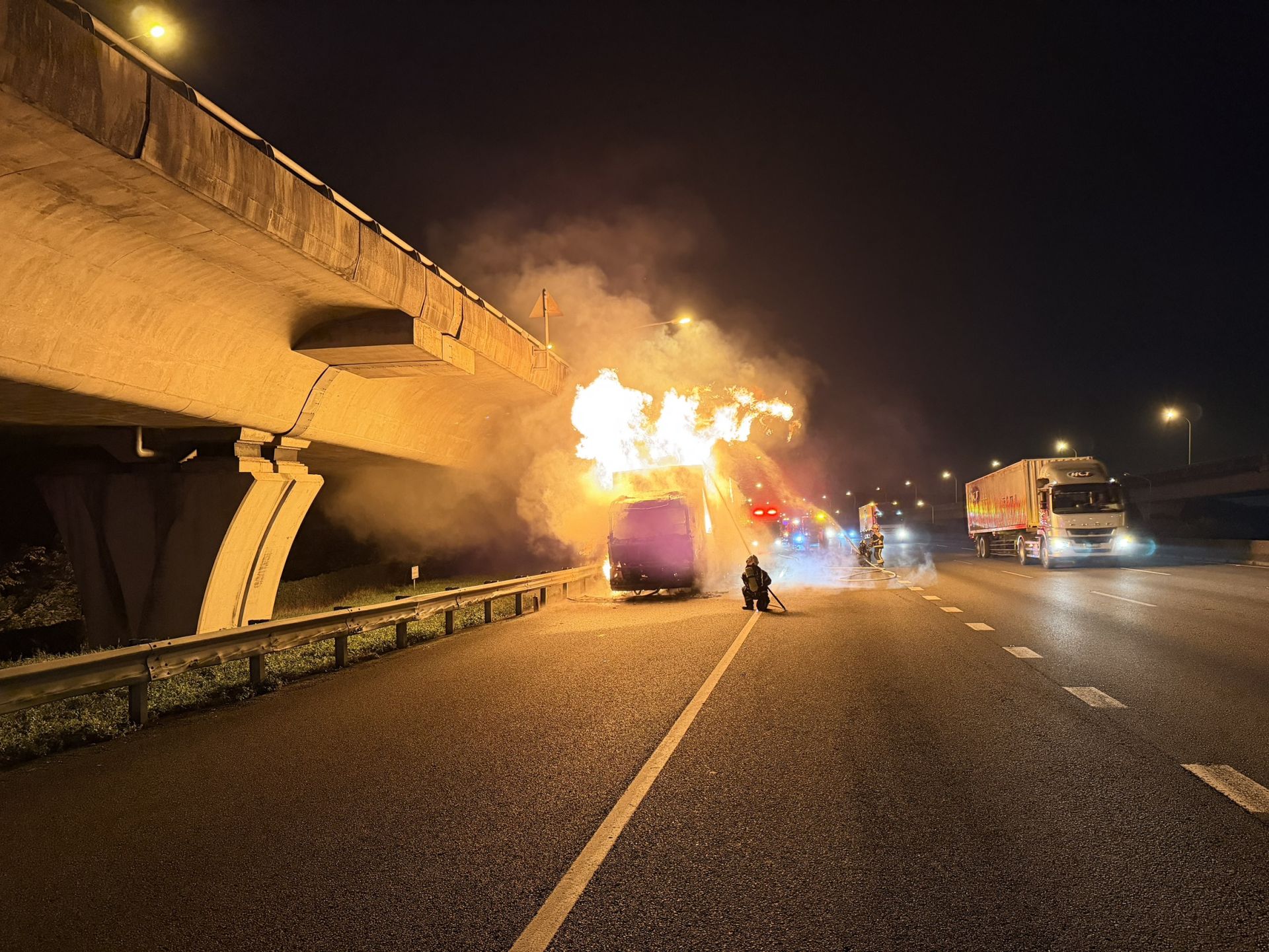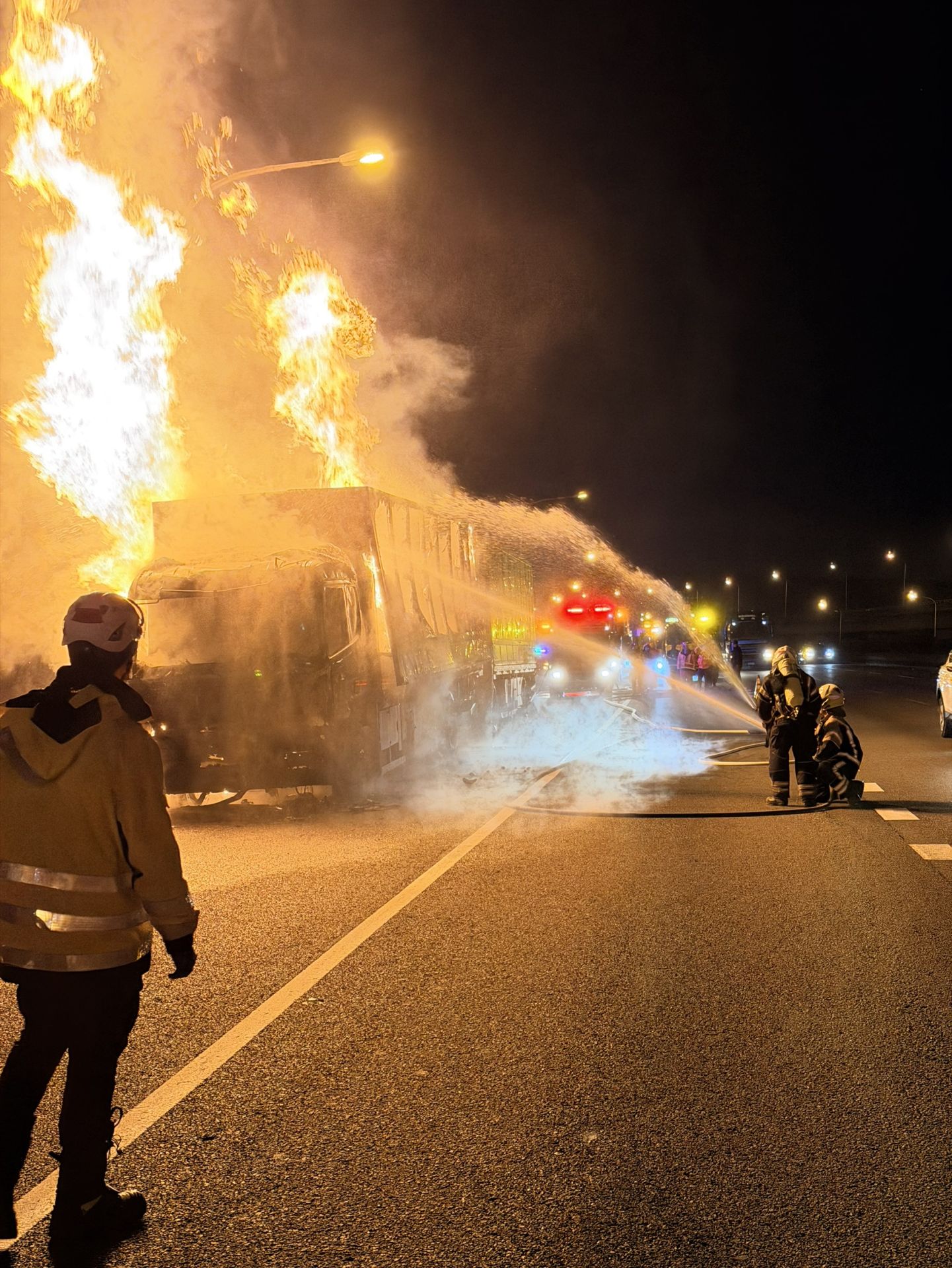 【Lai傳媒、記者爆料網/林千允/台北報導】國道1號林口路段今(6)日凌晨驚傳火燒車事故,一輛載運食品的全聯結車行駛途中突然起火,整車貨物幾乎燒光,所幸駕駛機警應變、及時逃生,未造成人員傷亡,也未波及其他車輛。