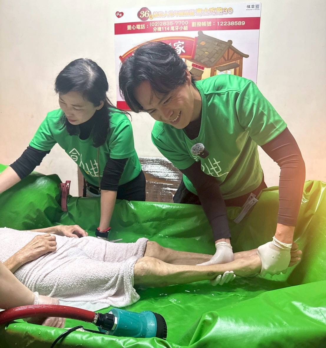 ▲黃鐙輝擔任創世一日到宅義工,為王爺爺原床泡澡。圖/創世基金會提供