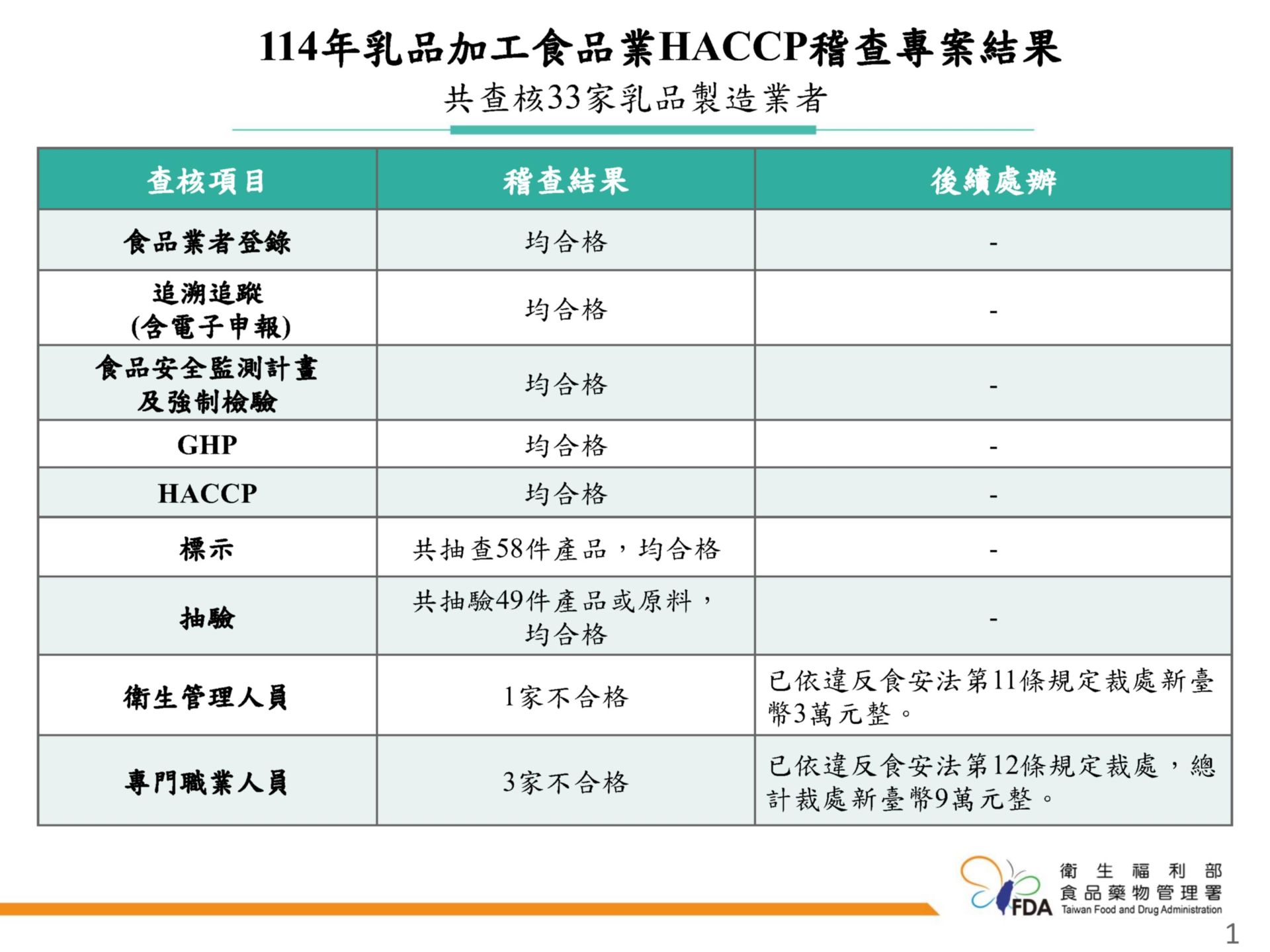 這次稽查專案由食藥署聯合各地方政府衛生局一起執行,主要針對國內乳品加工製造業的衛生管理進行全面體檢。除了實地查核33家業者,還抽查了58件產品標示,並抽驗49件乳製品或原料,檢驗結果都符合規定,沒有問題。