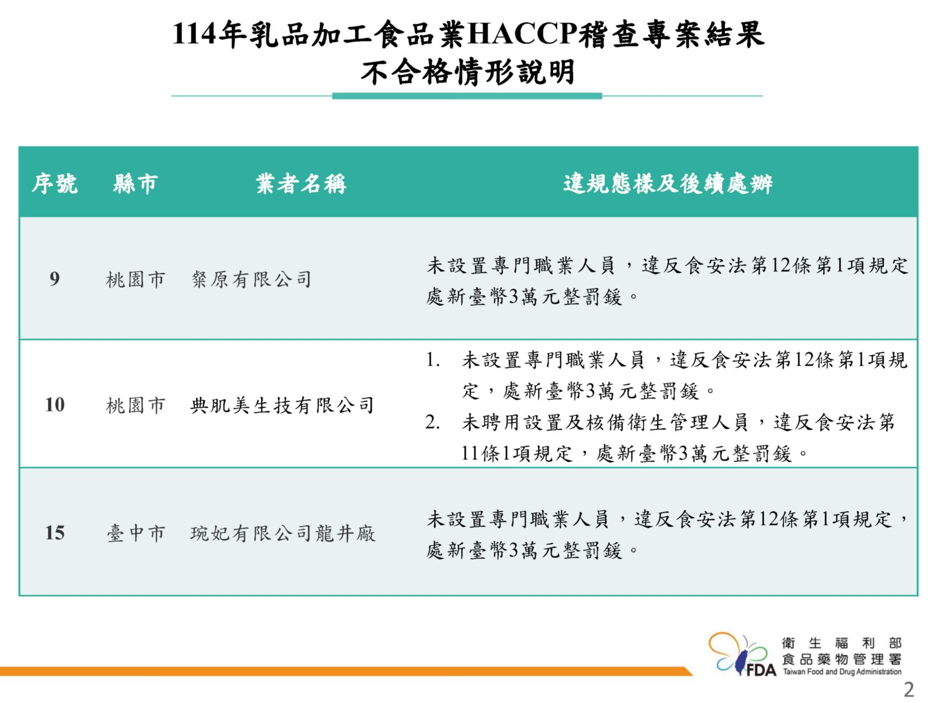 【Lai傳媒、記者爆料網/林千允/綜合報導】食藥署今天公布「114年乳品加工食品業HACCP稽查專案」結果,總共查核33家乳品製造業者,結果發現有3家業者沒有設置專門職業人員,另外還有1家連衛生管理人員都沒有設置,通通被罰款,總計裁罰12萬元。