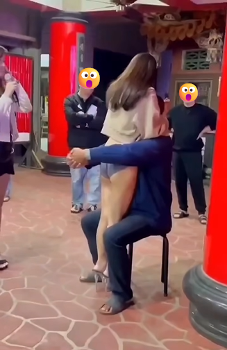 從影片中可見,活動地點就在廟宇前方,女子身穿內衣褲、外搭外套,站在男子雙腿之間,雙手環抱對方頭部,讓男子臉部貼近胸前,全程毫不避諱鏡頭。互動結束後,男子當場掏出百元鈔票交給女子,小費畫面也被完整拍下。