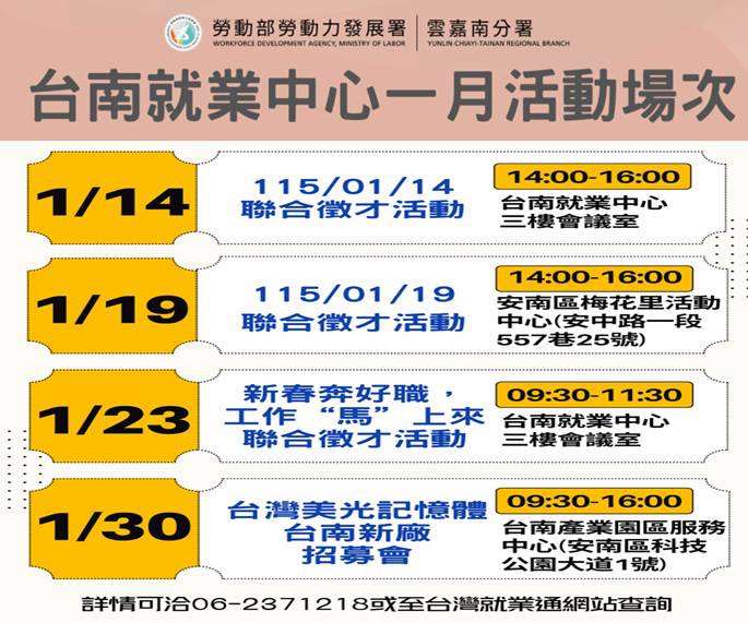活動相關訊息歡迎撥打06-2371218洽詢。如果想了解更多的徵才活動,歡迎上「台灣就業通網站-徵才專區」查詢(https://pse.is/4mvchp)。