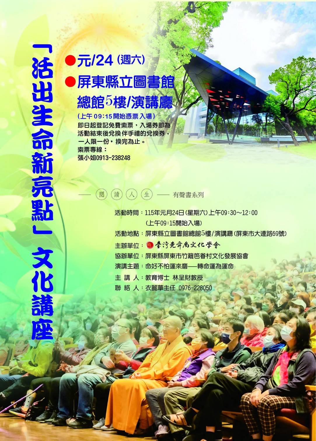 為推廣正向人生觀與文化素養,臺灣堯舜禹文化學會將於115年1月24日(星期六)上午9時30分至12時,在屏東縣立圖書館總館5樓演講廳舉辦「活出生命新亮點」文化講座,邀請教育博士林呈財教授擔任主講,與民眾分享如何在生命歷程中轉化困境、掌握命運。