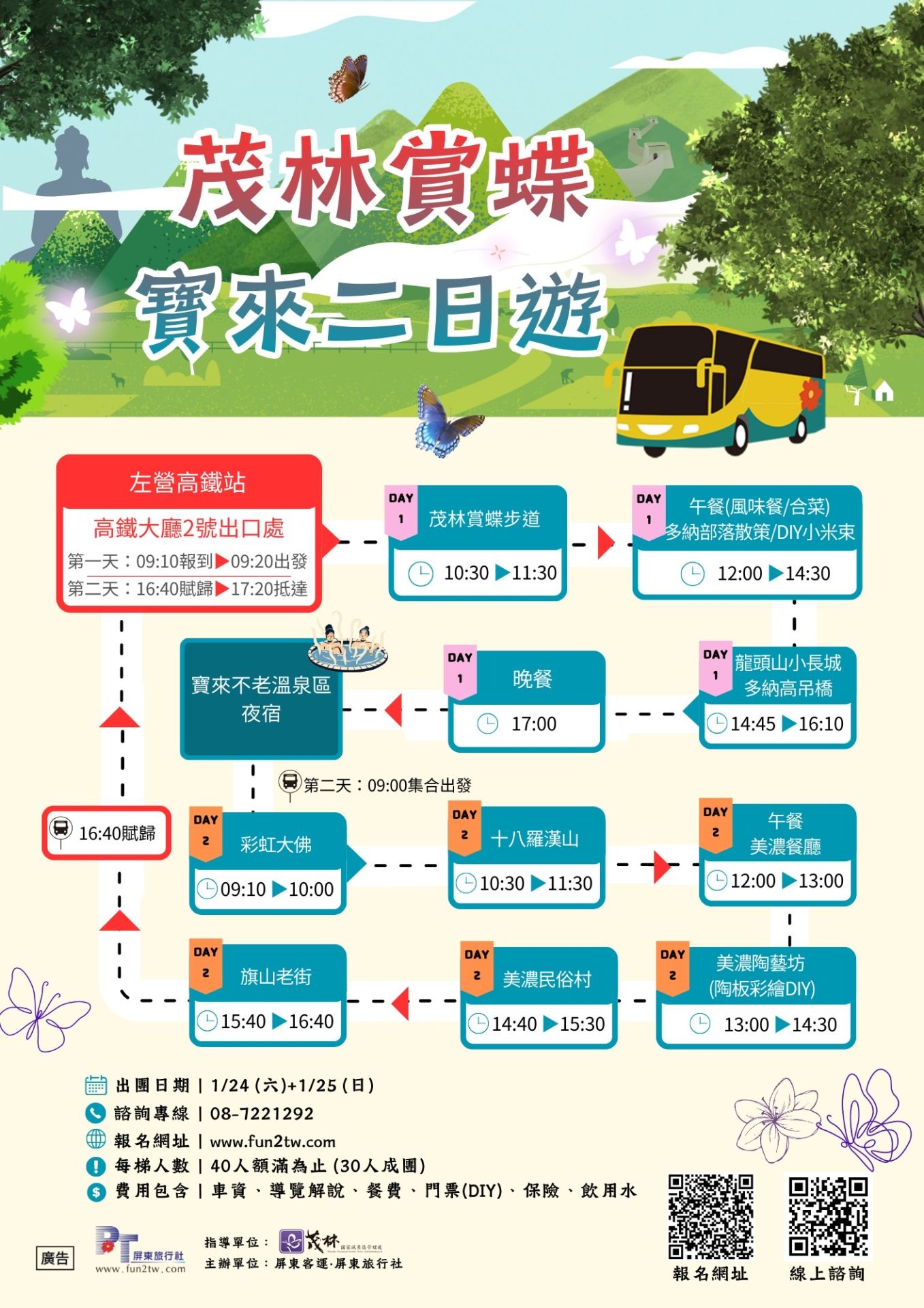 本次主題遊程共規劃多條一日遊與二日遊路線,行程涵蓋茂林賞蝶步道、多納部落散策、原住民文化園區、旗山老街、十八羅漢山遊憩區及寶來、不老溫泉區等知名景點,並安排專業解說人員隨行,讓遊客更全面了解紫斑蝶生態,以及茂林地區的自然景觀與人文特色。