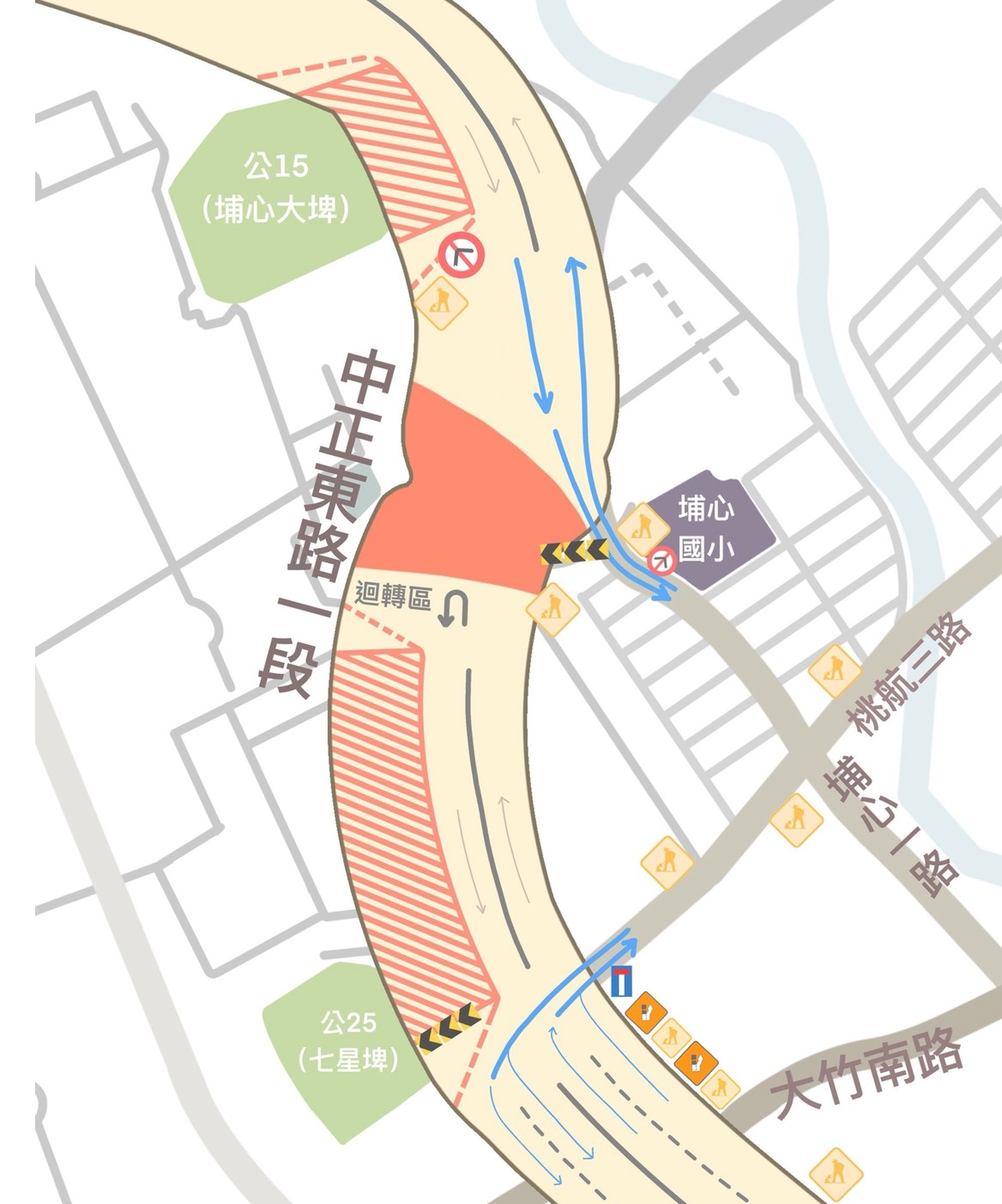 本次施工係為辦理1-1-60M(航空城大道)尚未完成之排水箱涵工程,將既有下水道系統向上游延伸約180公尺,以改善埔心100-21號一帶過往易淹水問題。配合道路全線封閉措施,考量車輛轉向視距及路口平均延滯情形,中正東路與埔心街路口將實施禁止左轉管制,並於上游路段提前設置告示牌面,同時施工前經與地方議員、里長及相關單位溝通協調,於施工區周邊預留在地居民進出通道,維持日常通行需求。
