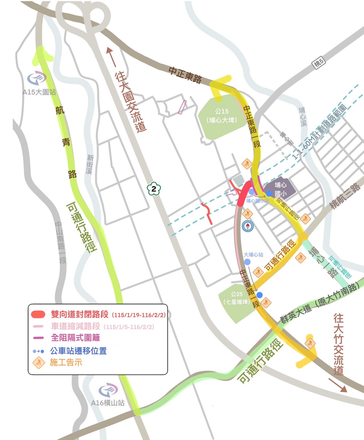 一、埔心一路路口至桃航三路區間自115年1月19日至116年2月2日止全天改道施工。