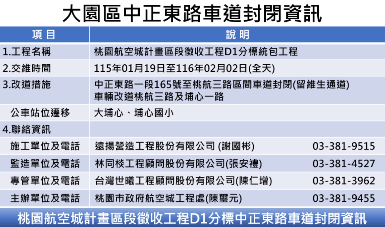 相關資訊放置於「桃園市政府航空城工程處官網/訊息公告/交維訊息」(網址:https://oapc.tycg.gov.tw),請民眾可善加利用,如對封路改道有任何疑問,可電洽主辦單位(03)381-9455或公告相關單位詢問。