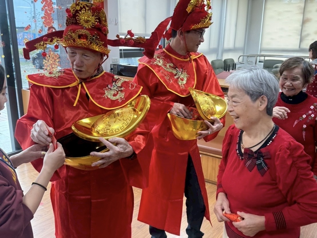 活動一開始,長輩們換上喜氣洋洋的紅色服裝,讓整間教室瞬間充滿熱鬧滾滾的過年氣氛。高齡九十多歲的阿樟伯扮成財神爺,象徵福氣與長壽,與黃永欽鄉長一同發放糖果,祝福大家「吃甜甜、過好年」,現場笑聲不斷、氣氛溫馨。緊接著由阿添伯、阿良伯、阿春伯化身蚌殼精熱鬧登場,寓意新的一年平安納福、好運連連。