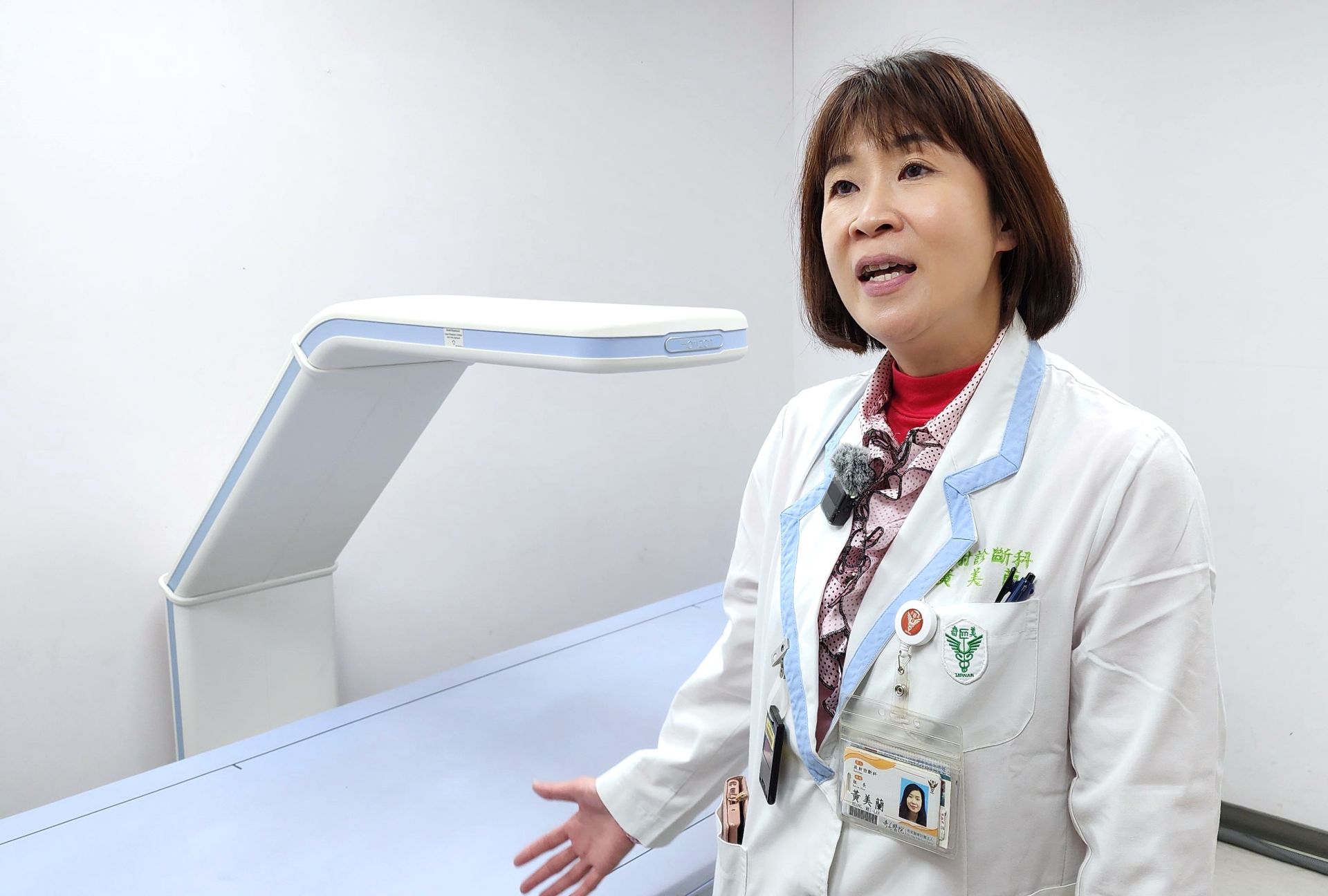 ▲放射診斷科超音波乳房影像骨質密度組組長黃美蘭介紹雙能量X光吸收儀(DXA),除了精確判讀骨密度,更能揭露肌肉量與脂肪分佈的真相。(圖/奇美醫院提供)