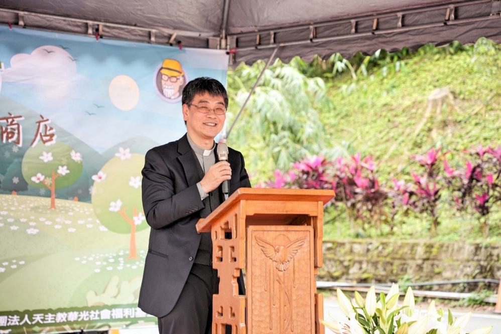 ▲由財團法人天主教華光社會福利基金會與全家便利商店合作設立的磊質庇護工坊(全家華光店)啟用儀式,華光社會福利基金會董事長徐森義致詞。(圖/華光社會福利基金會提供)