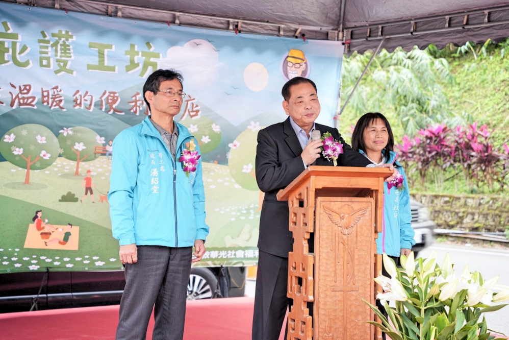 ▲由財團法人天主教華光社會福利基金會與全家便利商店合作設立的磊質庇護工坊(全家華光店)啟用儀式,新竹縣副縣長陳見賢(中)致詞。(圖/華光社會福利基金會提供)