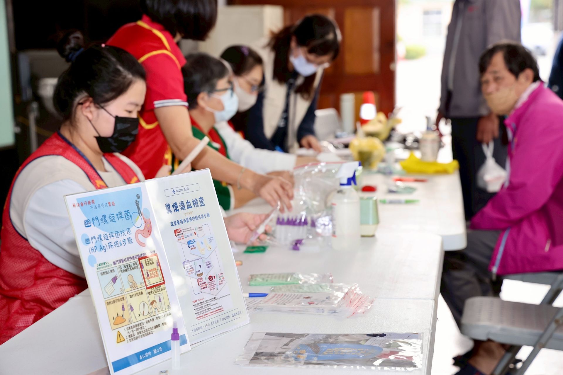 志工與工作人員於行動醫院健檢現場協助民眾填寫資料與說明檢查內容,貼心引導市民完成各項流程,讓健康服務深入社區、照顧每一位市民。