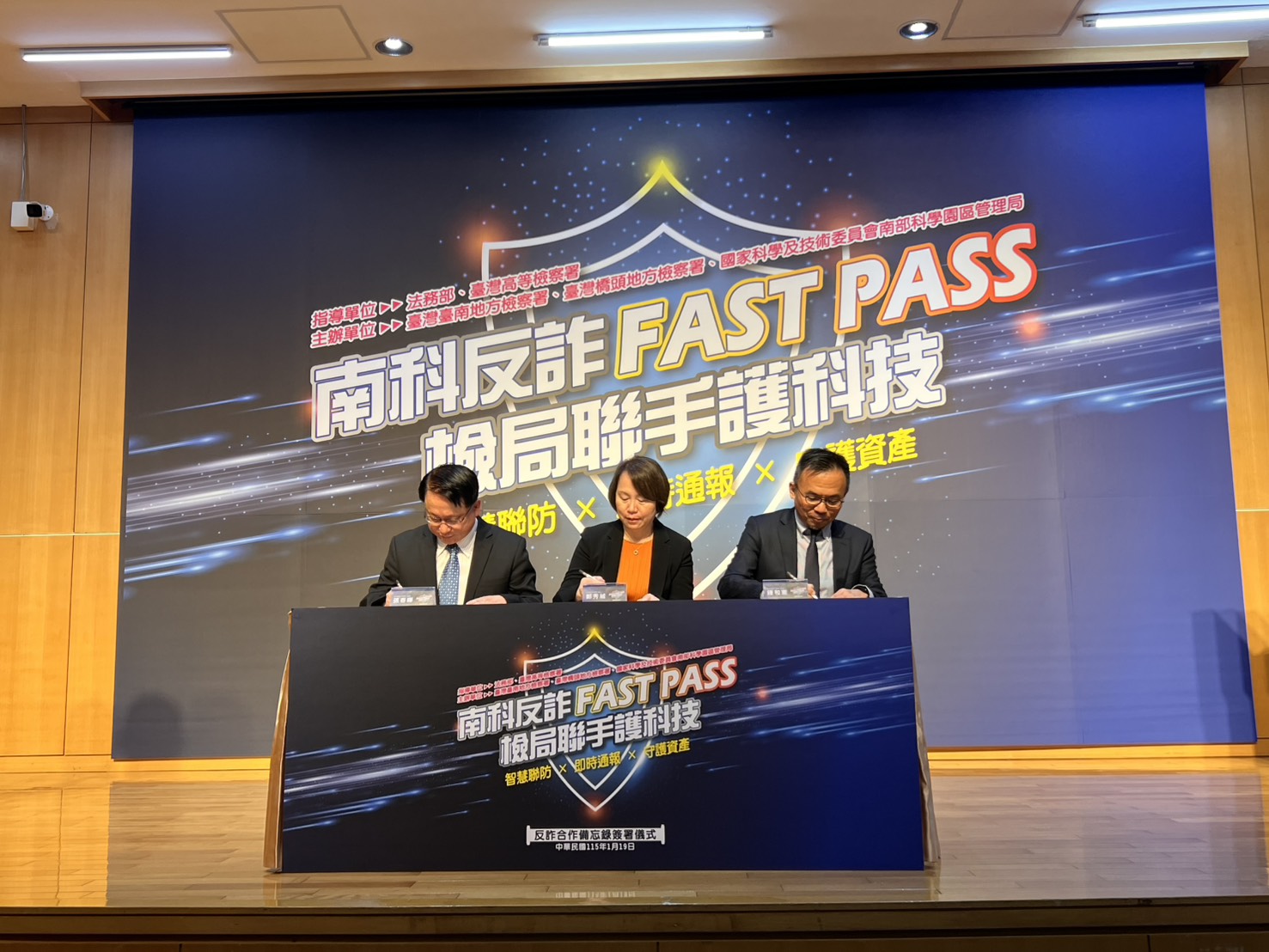 法務部長鄭銘謙、臺灣高等檢察署檢察長張斗輝特於今(19)日,親臨國家科學及技術委員會南部科學園區管理局,見證臺南地檢署、橋頭地檢署與南科管理局共同簽署「反詐合作備忘錄」。為守護臺灣科技產業,防制詐騙集團鎖定高科技產業人才,由南檢檢察長鍾和憲、橋檢檢察長張春暉、南科管理局局長鄭秀絨代表三方共同簽署「反詐合作備忘錄」,宣示由檢察署、管理局、企業共同組成反詐鐵三角,以「智慧聯防」、「即時通報」、「守護資產」來捍衛臺灣科技產業命脈。這次還有國家科學技術委員會、臺灣科學園區科學工業同業公會、臺南市政府警察局、高雄市政府警察局、內政部移民署南區事務大隊、工商企業等代表近百人前來共襄盛舉。