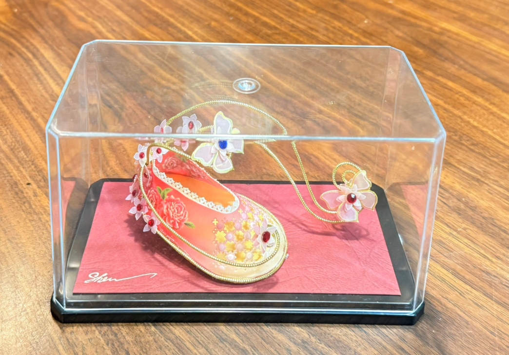 沈海蓉屏東拜訪母校師長,親手致贈戴貴立老師的「福慧鞋」,寓意祈求福慧雙修、福慧圆滿,以掛式框作可吊掛於家中轉角,若當擺飾可放置於書櫃、電視櫃等裝飾環境、提升氣氛之外,亦取「鞋」其諧音為家中「和諧」。單隻為獨占鰲頭、步步高升之祝福。若是一雙,則為彌月之喜,祝願孩子一步一踏皆平安、健康長大。這個禮物,讓戴珍藏多年,直到屏果新報採訪他,才把沈海蓉作品拿出來。