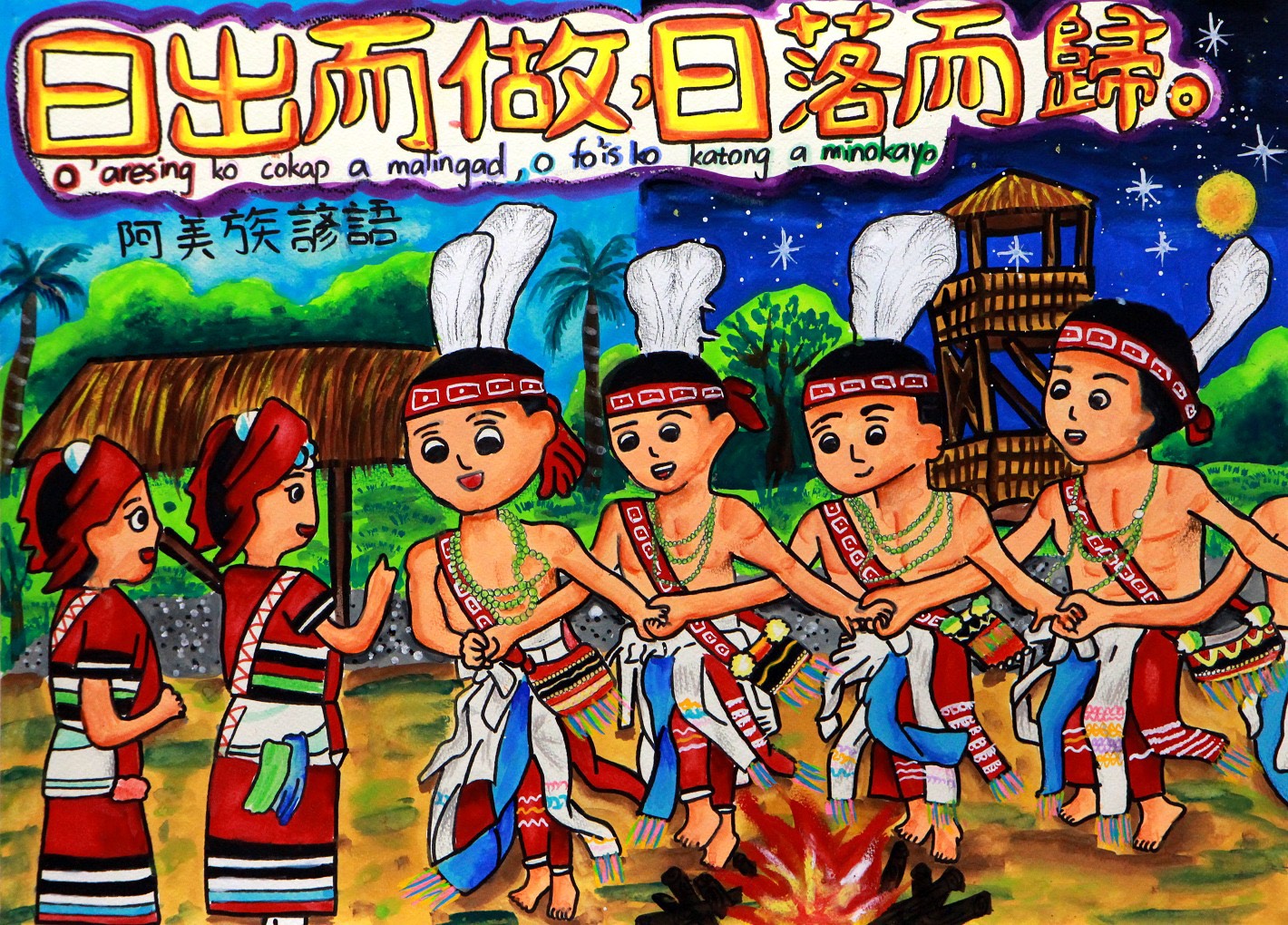 教育局指出,這次展出的45件作品,均展現出極高的藝術水準與文化觀察力。佳興國中許涵晴以《日出而做,日落而歸》展現阿美族圖騰的族群特色;保東國小陳芯妍以《一个某無人知,兩个某相卸代》奪得國小中年級組第一名,畫面動感且色彩和諧,生動突顯台語俗諺意涵;佳興國小翁宥薰則以客語四縣腔俗諺《跌一擺,撿到一隻金雞嫲》為題,透過繁複構圖呈現,傳遞客家務實精神。此外,新營國小吳秉檉《入境隨俗》則以印尼語描繪熱鬧場景,充分呈現各族群語言文化的深層意象。