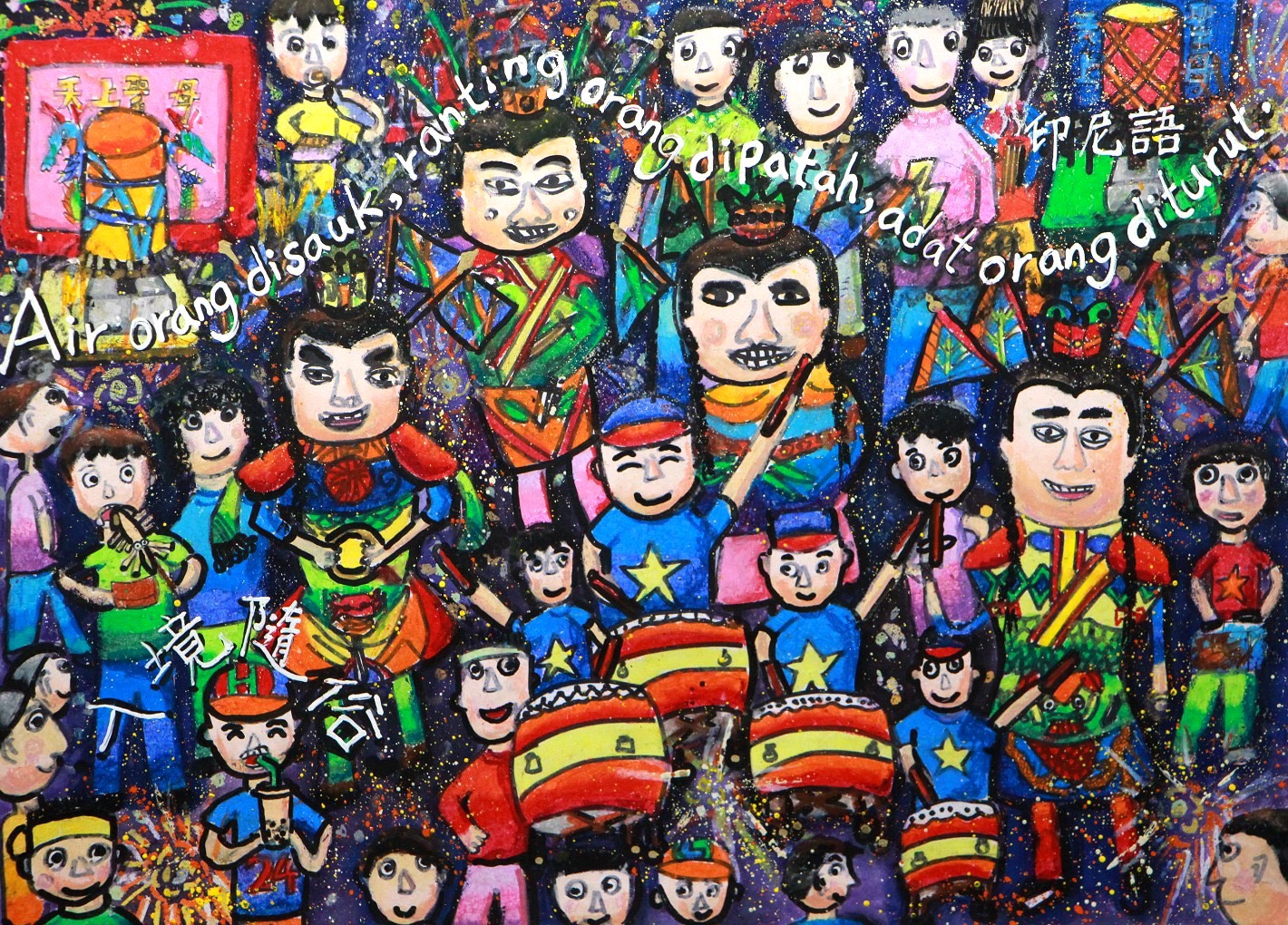 ▲新營國小吳秉檉《入境隨俗》則以印尼語描繪熱鬧場景,充分呈現各族群語言文化的深層意象。(教育局 提供)